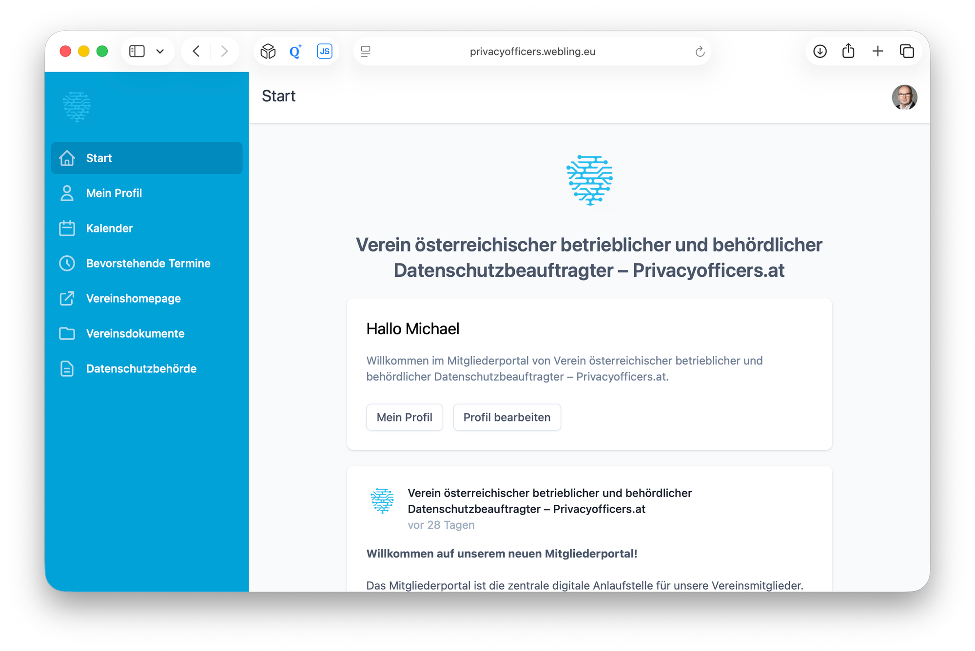 - Kalender: Zugriff auf den Vereinskalender mit Veranstaltungen von Privacyofficers und Partnerorganisationen. Hier können Sie sich zu Privacyofficers-Events an- und abmelden.
