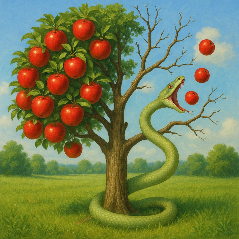 Darauf sagte die Schlange: „Nein, du wirst deine Freiheit nicht verlieren, du bekommst Reichtum, Sicherheit und unendliche Weisheit. Sobald du mir einen Apfel schenkst, gehen dir die Augen auf; du wirst wie Gott und erkennst Gut und Böse.“