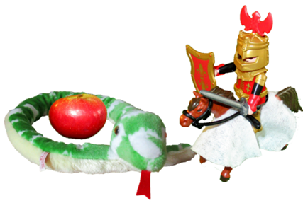 Der Mensch hatte Angst und begann zu rufen: „Guter Ritter TOM! Komm! Hilf mir! Schütze mich vor den Blicken der bösen Schlange PI! Sie hat meine Äpfel, mein Ein und Alles, meine Daten verspeist.“